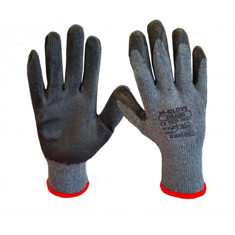 Rękawice ochronne wykonane z szarej dzianiny bawełnianej, powlekane miękkim odpornym na ścieranie lateksem w kolorze czarnym.