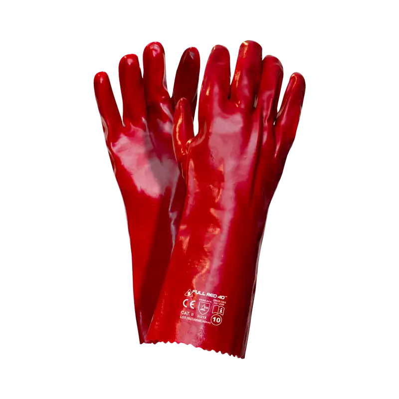 Rękawice ochronne wykonane na wkładzie z dzianiny bawełnianej. W całości powlekane warstwą PVC w kolorze czerwonym, zakończone oblanym mankietem, dzięki czemu rękawica osiąga długość 40 cm. Miękka i elastyczna powłoka pozwala na manualny chwyt.