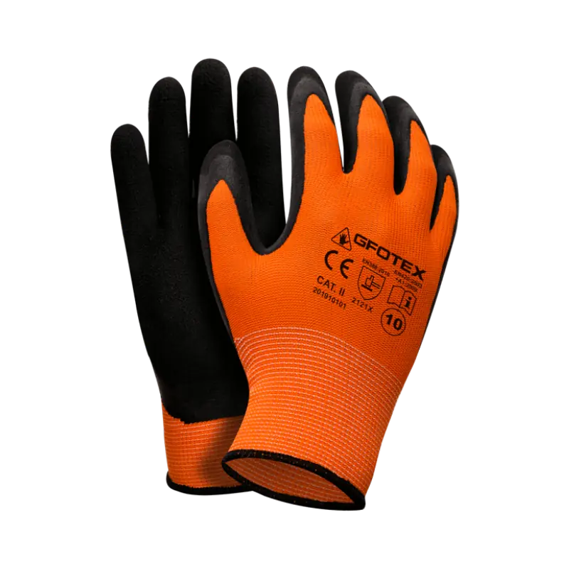 Rękawice wykonane z wytrzymałej, bezszwowej dzianiny (ścieg 13, 100% poliester), w kolorze pomarańczowym, zakończone ściągaczem, dłoń oblana spienionym lateksem w kolorze czarnym.