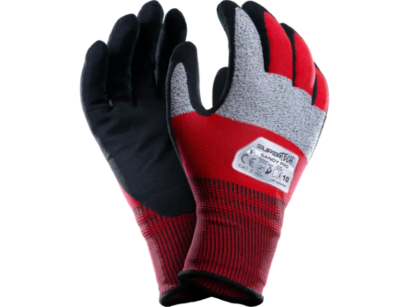 Rękawice ochronne wykonane z czerwono-szarego nylonu z domieszką spandexu , w części dłoniowej pokryte nitrylem typu sandy finish. Nitryl zwiększa odporność na tłuszcze i oleje, a technologia piaskowa zwiększa elastyczność i zręczność rękawicy.