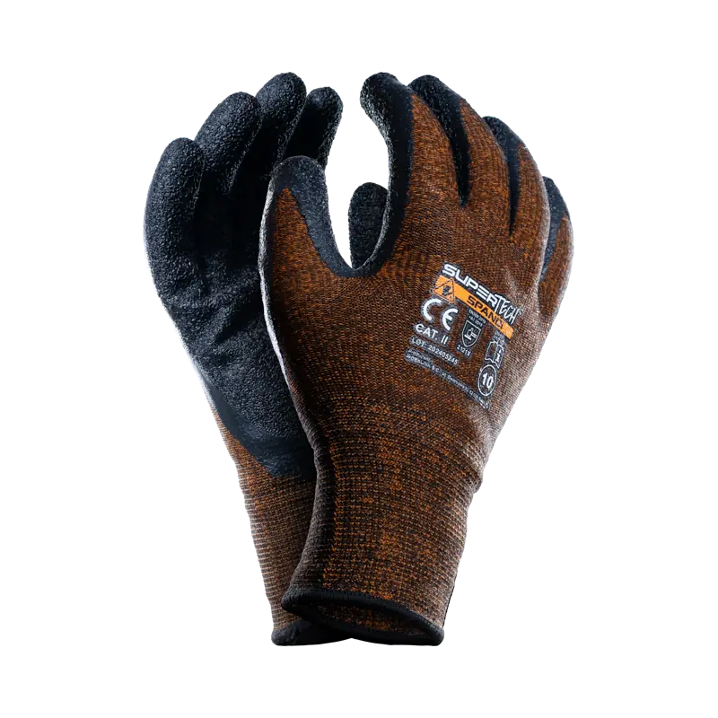 Bezszwowe rękawice ochronne, wykonane z dzianiny poliestrowej w połączeniu ze spandexem (ścieg 13), co gwarantuje elastyczność i idealne dopasowanie do dłoni, zapewniając lepszą ochronę, przewiewność i większy zakres wykonywanych ruchów. Powlekane marszczonym lateksem w kolorze czarnym.