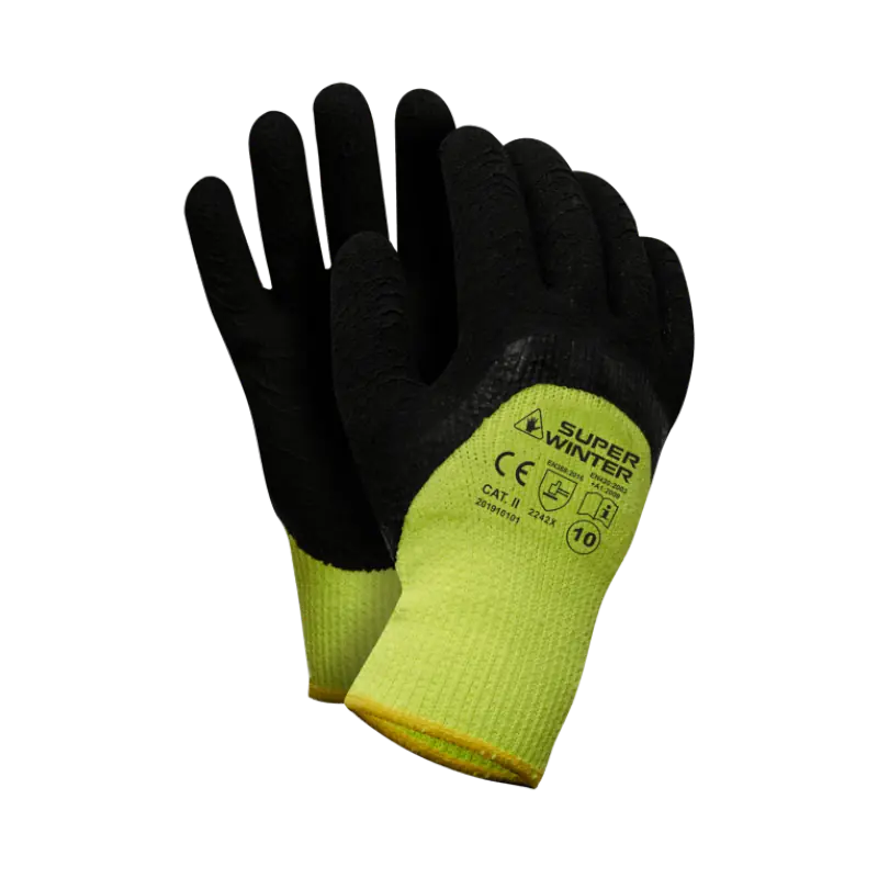 Rękawice ochronne, wykonane z pętelkowej dzianiny poliestrowej (ścieg 7), powlekane czarnym lateksem typu foam, oblewane do kości śródręcza, dobrze ocieplone.